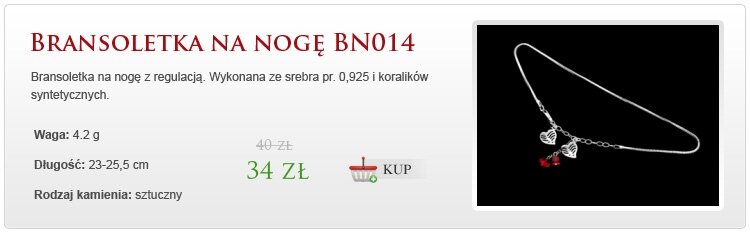 Dostępna w naszym sklepie internetowym biżuteria srebrna stanowi doskonały dodatek dla każdej eleganckiej kobiety. Proponujemy ciekawe wisiorki, efektowne kolczyki, delikatne bransoletki i wyjątkowe pierścionki, które będą idealnym dodatkiem do stroju wielbicielki pięknych akcesoriów. Duży wybór wzorów oraz kolorystyki, uzyskanych nie tylko dzięki unikalnym kształtom, ale także obecności kamieni szlachetnych, pozwoli każdej Pani odnaleźć ozdobę, która będzie pasowała do jej gustu i stylu. Proponowane przez nas dodatki to także idealny pomysł na prezent dla bliskiej osoby, który pozwoli jej czuć się wyjątkowo każdego dnia.